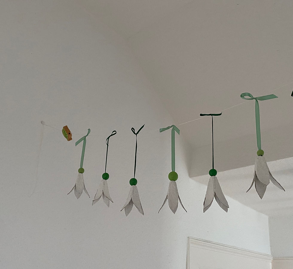 Mit Kindern kannst du dieses Gefühl ganz einfach nach drinnen holen – mit einem Projekt, das schnell gemacht ist, kaum Material braucht und gleichzeitig wunderbar nachhaltig ist: einer Schneeglöckchen-Girlande aus Eierkarton.